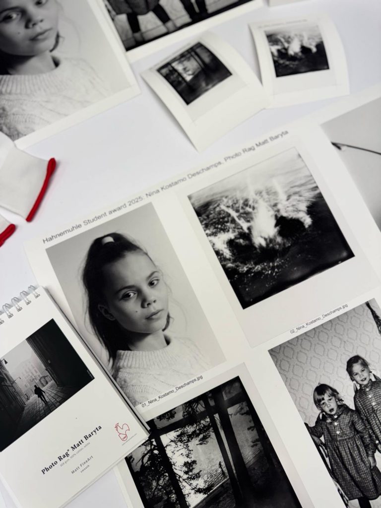 „For my series Usva, I chose Hahnemühle Photo Rag® Matt Baryta for its soft, tactile texture that enhances depth and fine detail. It feels well-suited to this collection of black and white Polaroid, film, and digital photographs—handling each format with sensitivity. I feel the paper’s sheen resonates with the mood of the series, adding a quiet tone that complements its atmosphere and reflective nature.“