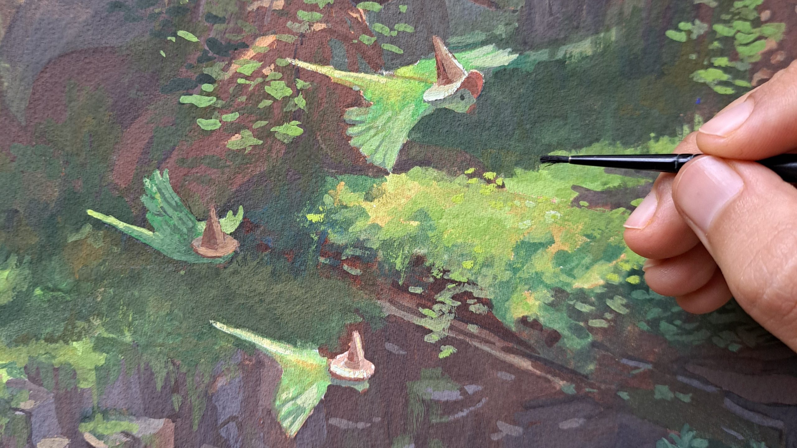 Gouache and watercolor are sisters. I first painted with watercolor and when I could afford to experiment I got my first set of gouache paints. Since then gouache has become my favorite medium because of its beautiful matt finish. The same techniques can be used for watercolor and gouache, such as wet-in-wet, dry brushing, etc, but in addition to that I love that gouache is more opaque. With careful layering and color mixing, a gouache illustration can look almost like a digital render, which I find incredibly satisfying. Now I use watercolor and gouache hand in hand sometimes, often using watercolor for the underpainting of a gouache illustration.