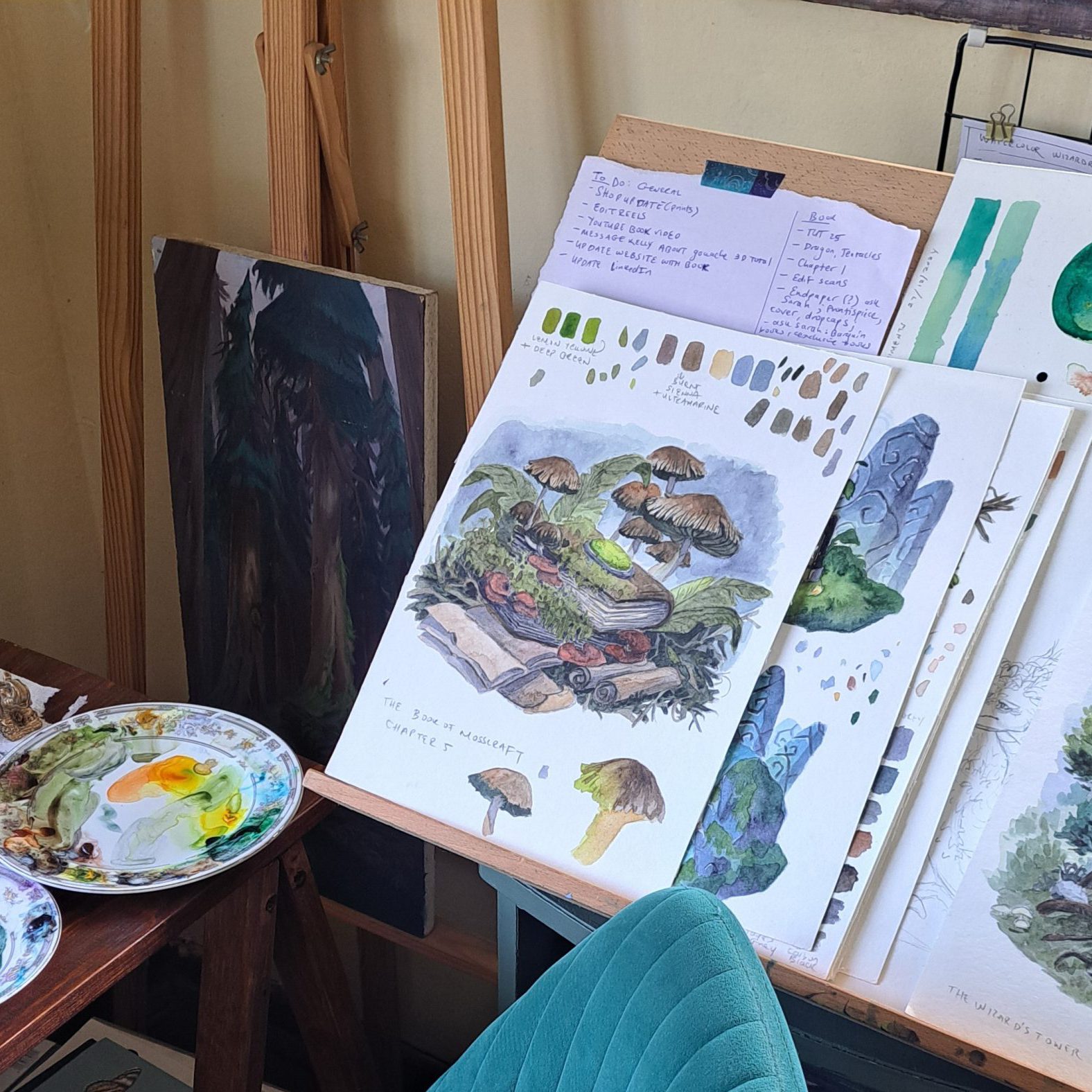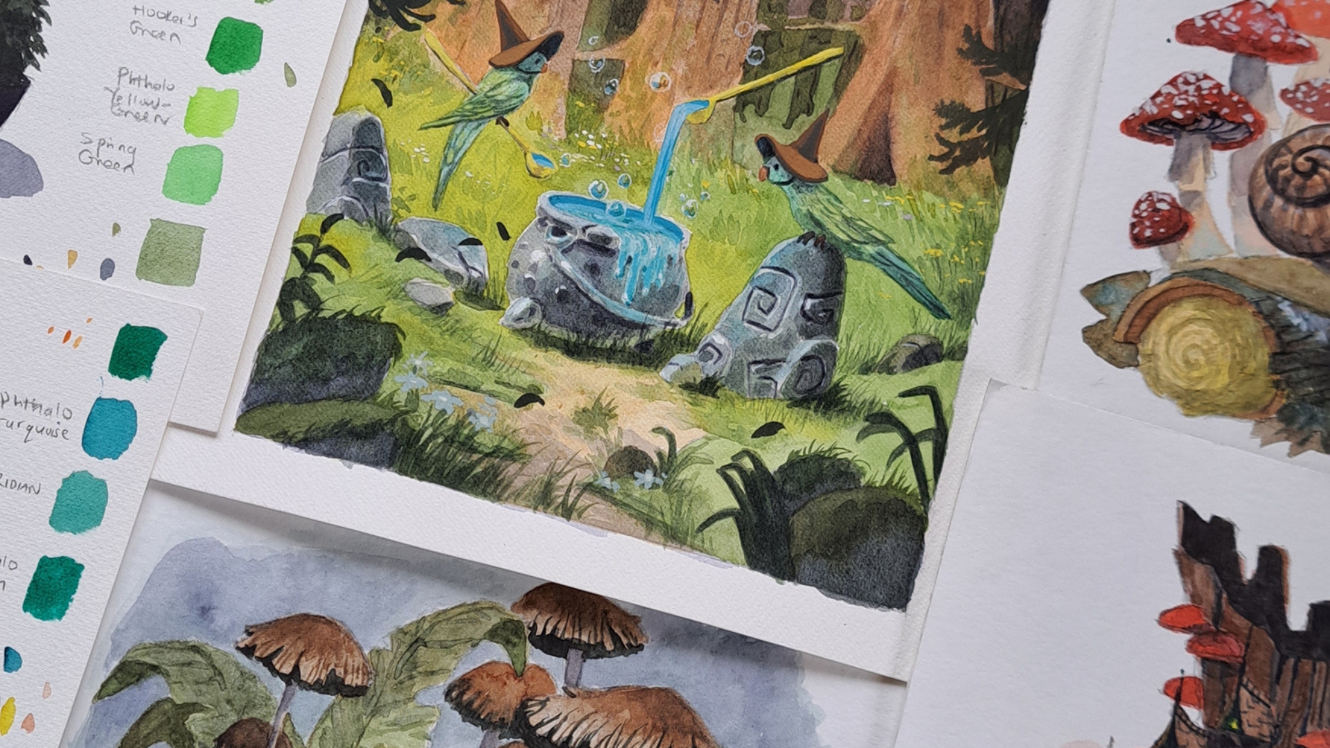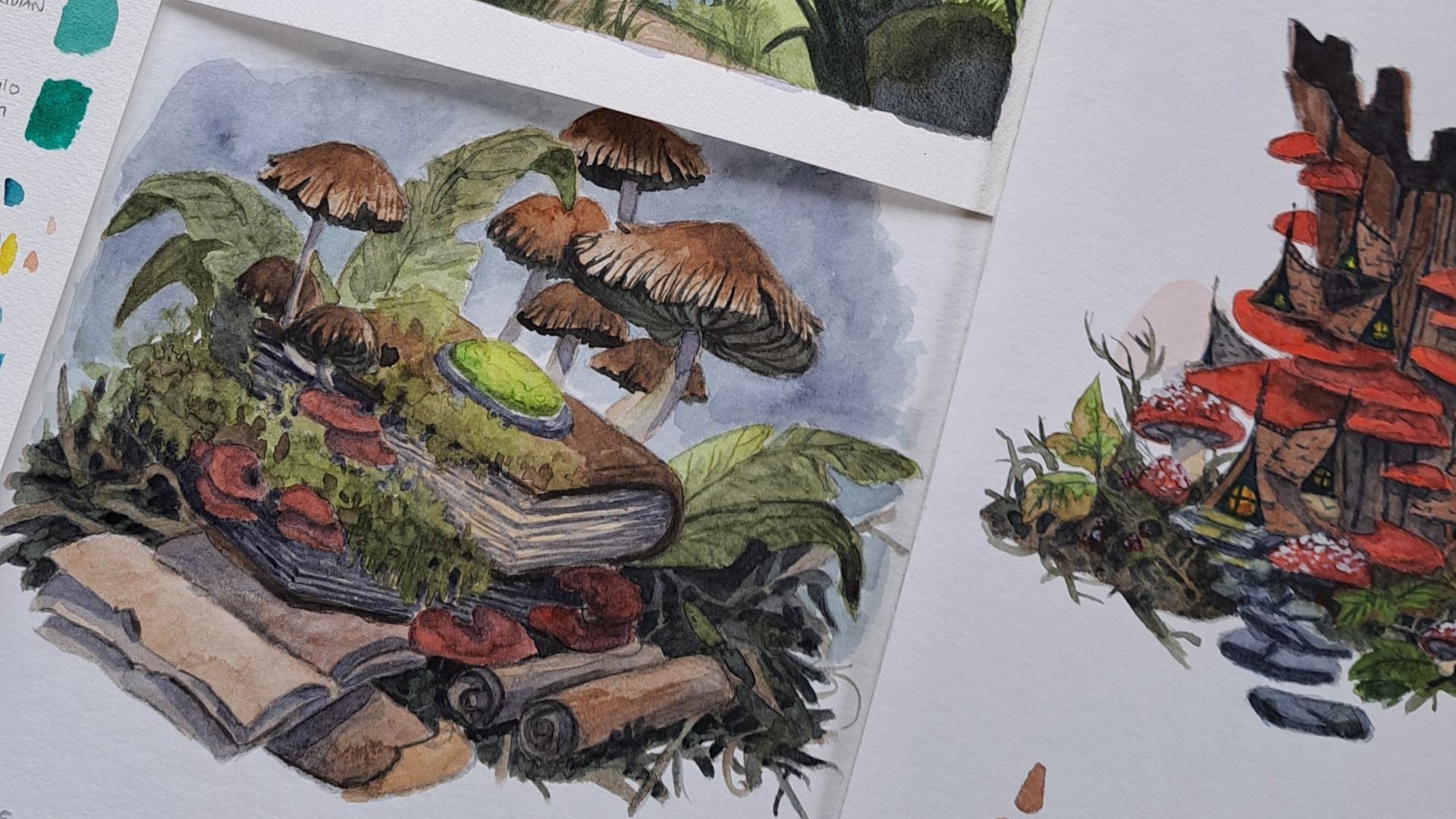 I am a book lover. I love the telepathic aspect of it. A book allows so much information to telepathically travel from one mind to another. Books also feel like a companion, sometimes I imagine them talking to me with their own personality. So growing up, if I found a book that was written in a more immersive or interactive way, it immediately gripped me. Some examples are Terry Pratchett’s Discworld series, and Lemony Snicket’s A Series of Unfortunate Events. These are authors who didn’t just write another world, but they spoke to the reader and whisked them away, and these are my biggest inspirations. So when writing Watercolor Wizardry, I was tasked to create 25 tutorials on how to paint fantasy forest scenes. But the storyteller side of me didn’t want it to be just another tutorial book. I wanted to make it more immersive while learning along the way.