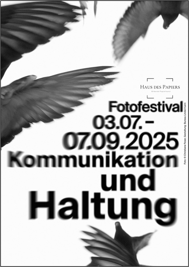 Vom 3. Juli bis zum 7. September 2025 präsentiert das Museum Haus des Papiers das Fotofestival Kommunikation und Haltung. Im Fokus steht das Thema „Demokratieverständnis und respektvolle Kommunikation“. Durch die Verwendung von Fotoplakaten findet die Kunst ihren Weg direkt in den Stadtraum: 29 renommierte Künstler:innen und Fotograf:innen zeigen ihre Werke an zahlreichen öffentlichen Orten in Berlin. Dokumentarische und künstlerische Ansätze treten dabei in einen spannungsvollen Dialog.