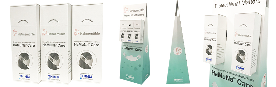 « En partenariat avec la société experte en packaging Thimm, nous avons conçu un distributeur pour les boîtes HaMuNa® Care. Ces distributeurs peuvent être placés à l’entrée des écoles, des magasins etc. Les visiteurs peuvent ainsi utiliser les masques des distributeurs. Ces distributeurs fabriqués de manière durable en carton ondulé peuvent être imprimés individuellement. » ajoute Jan Wölfle, CEO du groupe Hahnemühle.