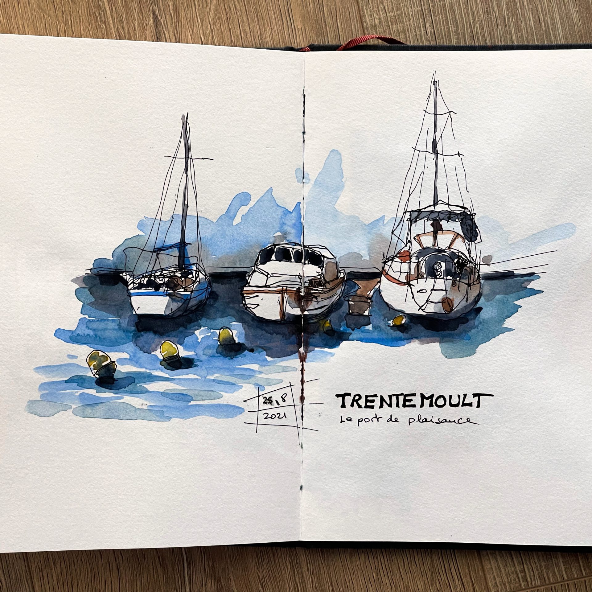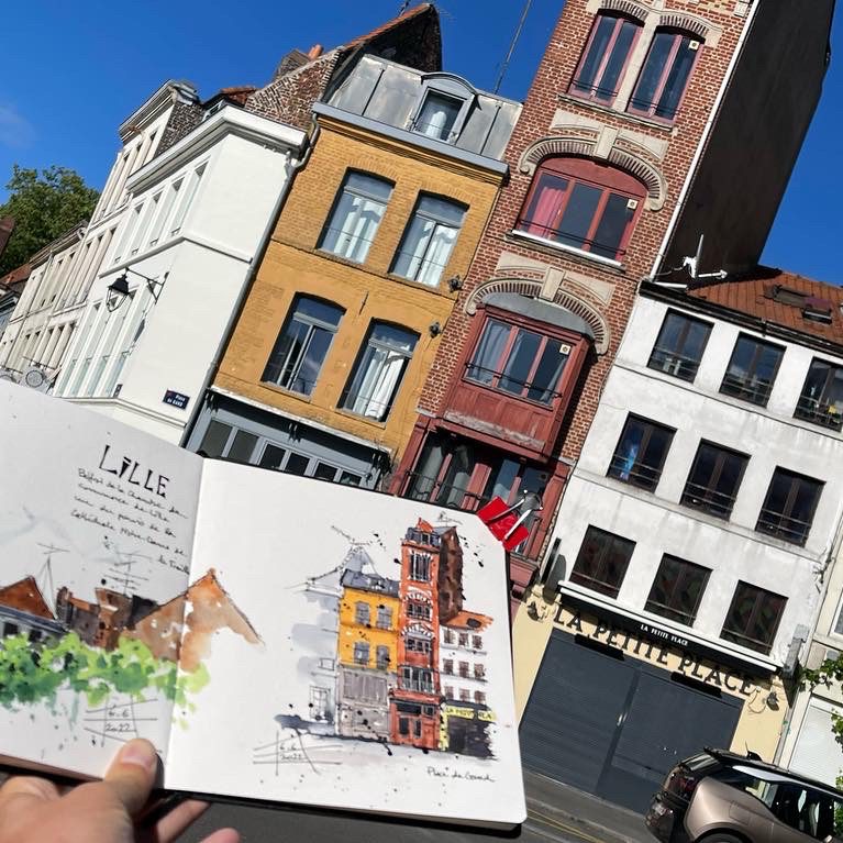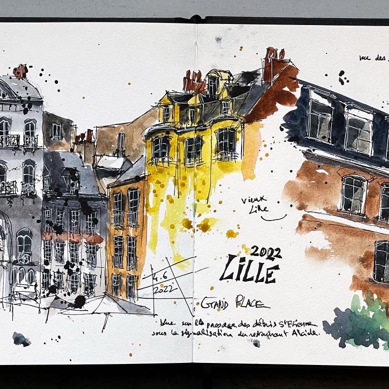 Depuis 4 ans ! J’ai commencé par les carnets. Après avoir testé plusieurs marques, j’ai finalement trouvé mon bonheur avec les Watercolour Book 200gr d’Hahnemühle que j’utilise dans différents formats : A5 vertical / horizontal, A4 vertical / horizontal, … J’ai eu cette année un gros coup de cœur avec la sortie du Watercolour Book 250 gr 100% coton. J’ai eu l’opportunité de le tester dès son lancement et je l’ai immédiatement adoré et adopté dans la foulée ! C’était LE carnet dont je rêvais pour ma pratique du croquis urbain. C’est aujourd’hui mon carnet de référence même si je continue à utiliser avec plaisir mon stock de carnets Watercolour Book 200gr.