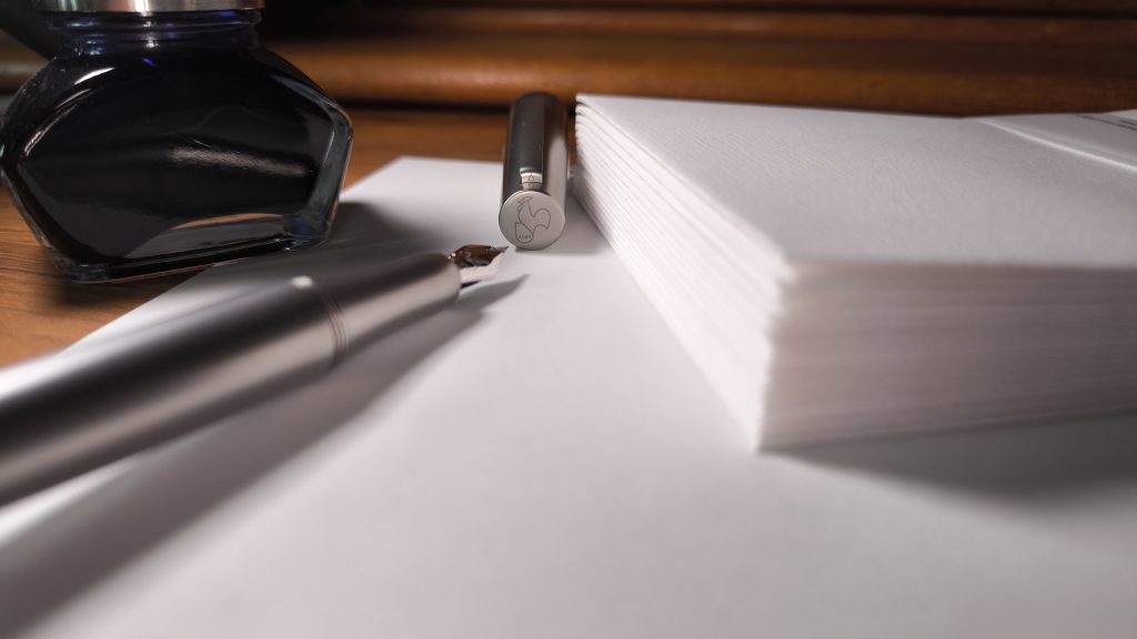 Les 30 feuilles de papier à lettres de qualité supérieure, de couleur crème, avec le filigrane du coq et un grammage de 100 g/m², sont le cœur du set. Lorsque je pose mon stylo-plume sur le papier pour la première fois, je sens l’encre couler parfaitement sur la surface lisse. Il est tellement facile d’écrire… Cela me donne envie de ne pas seulement prendre des notes, mais d’écrire une véritable lettre manuscrite – quelque chose que j’ai négligé depuis trop longtemps. Je réalise immédiatement : ce papier n’est pas seulement de haute qualité, il inspire.